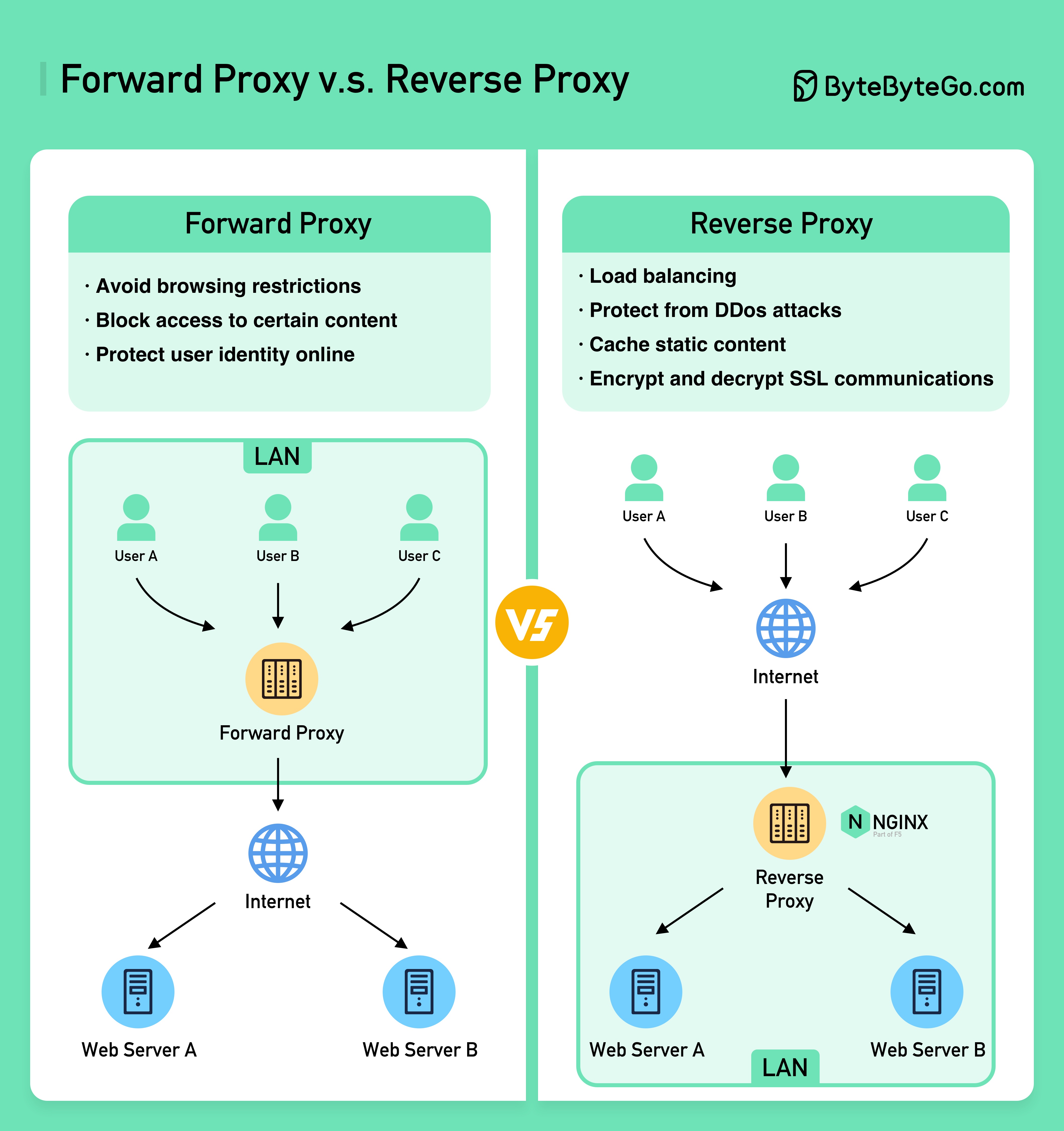 下图显示了转发代理和反向代理之间的区别。